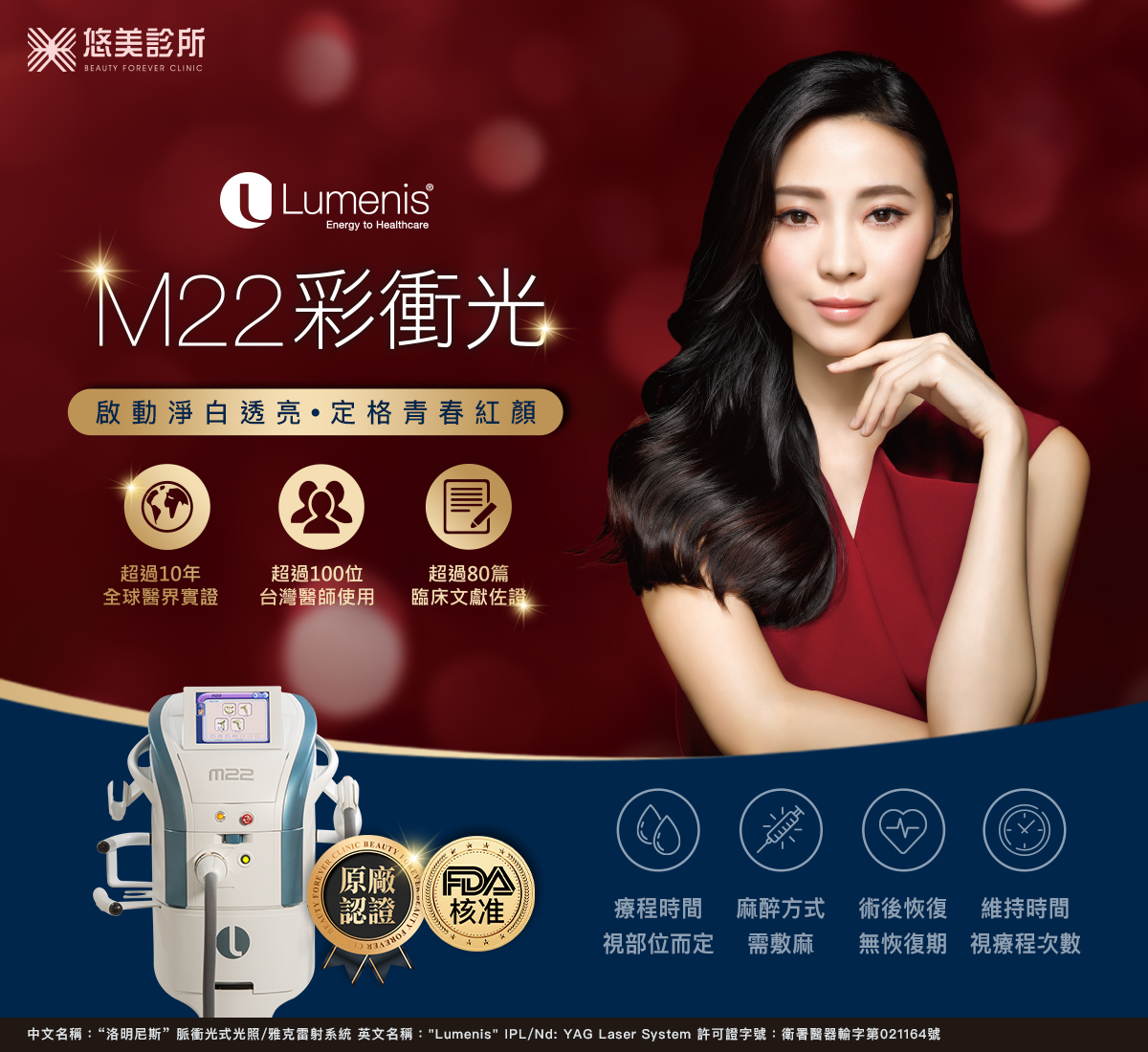 M22彩衝光(俗稱心動光)獲得美國FDA、歐盟CE與台灣衛福部多重認證,是多功能且具備兩種治療機頭的系統:脈衝光式照(Universal IPL,波長515~1200nm)、多點式銣雅克(Multi-Spot Nd:YAG,波長1064nm)雷射。