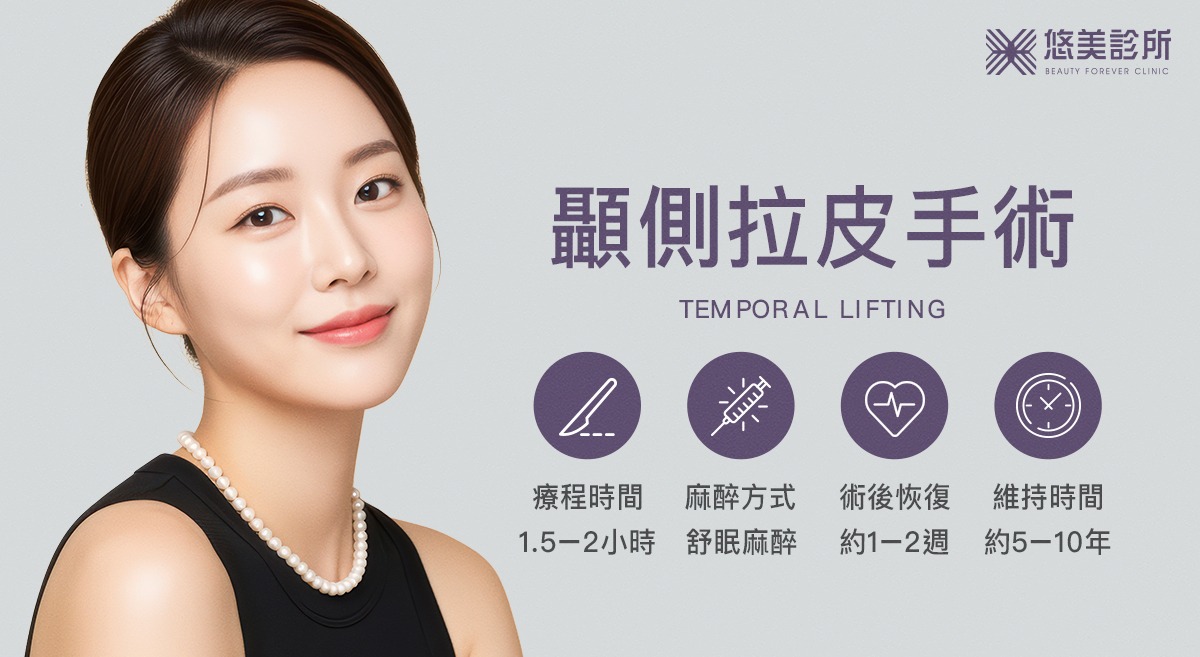 顳側拉皮(Temporal Lifting,又稱顎側拉皮)是一種針對臉部輕中度鬆弛所設計的精密微創拉提手術。主要透過隱藏於顳側(太陽穴)髮際線內的隱痕切口,針對老化位移的深層組織進行提拉與重新固定。此療程不僅能有效拉起下垂眼尾、撫平魚尾紋,更能針對蘋果肌鬆垂與嘴邊肉進行結構性調整。相較於僅作用於表層的電音波,顳側拉皮具備傷口微小、隱痕度極高且效果持久的優勢,是追求悄悄變年輕且不希望有冗長恢復期者的理想選擇。