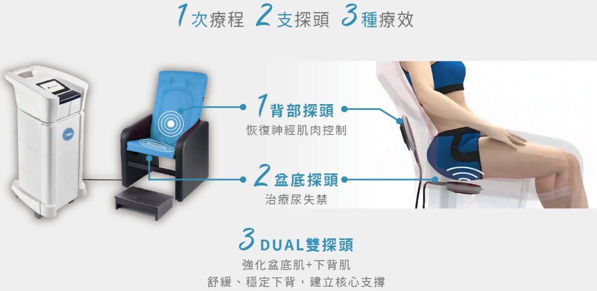 | 作用原理 | 全世界第一台雙探頭治療椅,高頻磁感科技」 觸發目標肌肉收縮,同時治療尿失禁與下背痛,穿透深度達10公分,能量無衰減傳遞到骨盆底深層肌肉 | 電磁場+遠紅外線,高強度聚焦電磁場刺激原理,透過渦電流刺激運動神經元,由淺至深刺激強化不同層次的肌群,隨著磁場強度與頻率的改變,肌⾁產⽣被動式間歇性收縮 | 高能量多頻聚焦磁能科技,直接觸發運動神經元,可刺激模擬肌肉運動,有效鍛鍊強化肌肉,提高肌肉量及肌肉疼痛放鬆舒緩 | 將磁波深入穿透會陰部,活化深層骨盆底肌肉及神經,剌激強化骨盆底肌肉群,藉由肌肉的反覆收縮和鬆弛運動,達到重建骨盆底肌與制尿系統的力量與耐力 | 高強度聚焦電磁技術,產生一萬多次超極限收縮,刺激骨盆底肌肉,深入並集中鍛鍊深層盆底肌肉 |