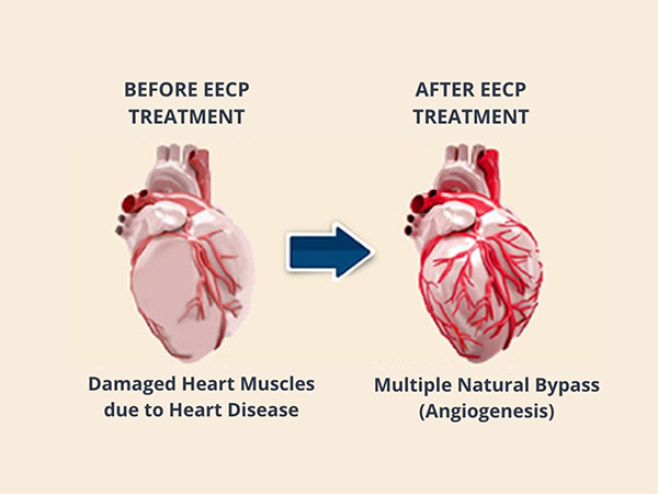 治療過程中,病患會平躺於特製的醫療床上,並分別在小腿、大腿和臀腹部綁上特製的氣囊套,壓力帶配合心電圖開始充氣(舒張期)以及放氣(收縮期),過程中感受「EECP就像在替血管做按摩,藉由外力的加壓及放鬆,讓心臟更容易運作,提高心肌血液及氧氣量,甚至在堵塞動脈附近發展出新的道路來增加血流、打開側枝循環、降低血管發炎、促進血管新生,因此又被稱為自然繞道(也有說法稱,EECP為身體外的第二顆心臟)!」
