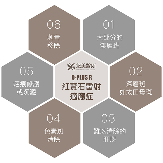 「Q-Plus R」新紅寶石雷射在Q開關雷射系統上,使用黑色素吸收專一性的雷射波長694nm,雷射穿透深度可至真皮層,移除表皮與真皮層的色素性病灶,且雷射波長的含氧血紅素吸收曲線極低,療程不易產生紫斑(Purpura) 或血管受損的副作用傷害。依照選擇性光熱分解的理論,為了減少對周邊組織的傷害,雷射的脈寬頻寬短於或接近毛囊的熱緩解時間為佳。